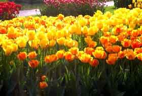 В середине апреля на смену приходят тюльпаны. Они красиво смотрятся как в группах, так и высаженные вдоль дорожек. По срокам цветения можно подобрать сорта, сменяющие друг друга в течение двух месяцев вплоть до начала лета. После того, как высохнут листья (обычно это бывает в начале июля), луковицы выкапывают и вновь высаживают начиная с середины сентября.